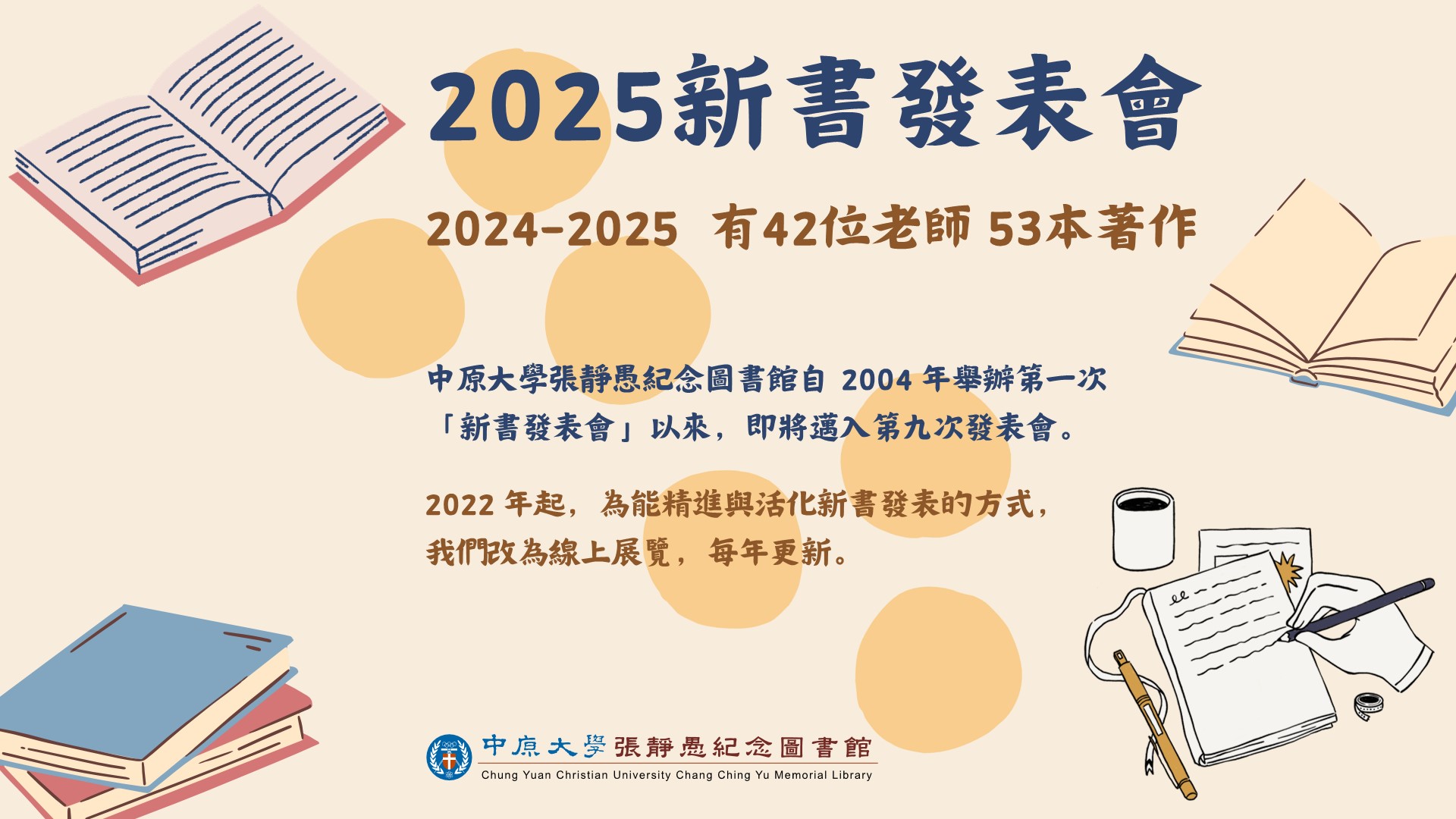 中原大學張靜愚紀念圖書館自 2004 年舉辦第一次「新書發表會」以來,即將邁入第九次發表會。從 2004 年的 3 位老師,到 2025 年的 42 位老師 53 本專書及部分專書,這期間的成長,展現中原大學老師們「樂研究.喜創作.愛閱讀」的特質。